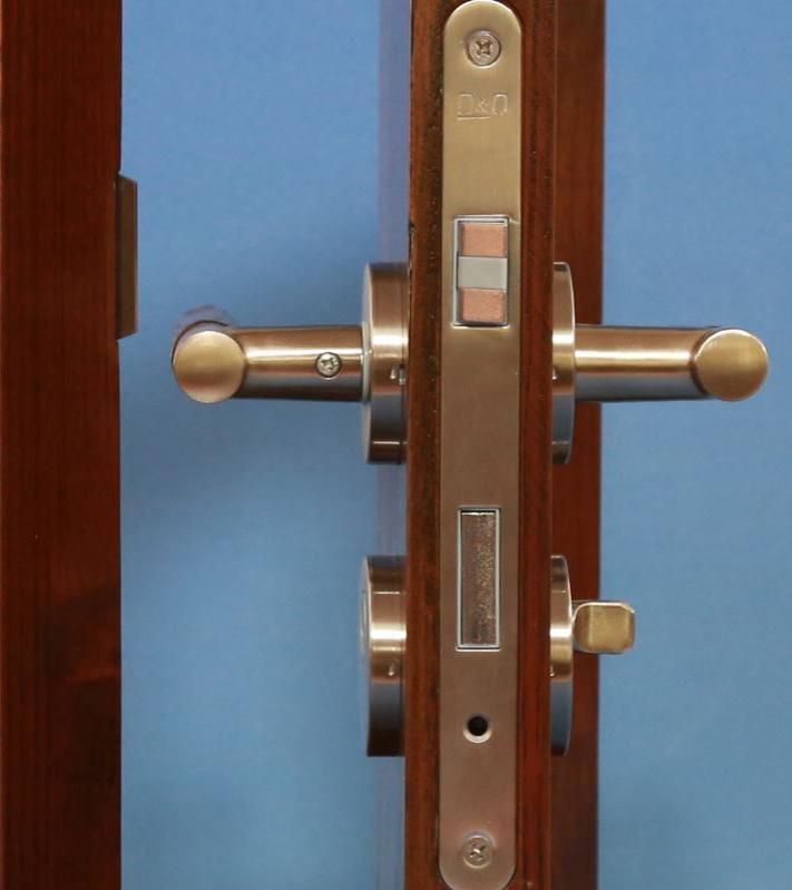Test after installation: Rotate the lever handles and press the latch bolt by hand in the inclined surface direction. The latch bolt should freely turn over and smoothly be pressed into and removed from the lock body. When pressing the latch bolt without the rotating lever handle, the latch bolt will not turn over. If the latch bolt operates smoothly, installation is complete. If not, reset all components.