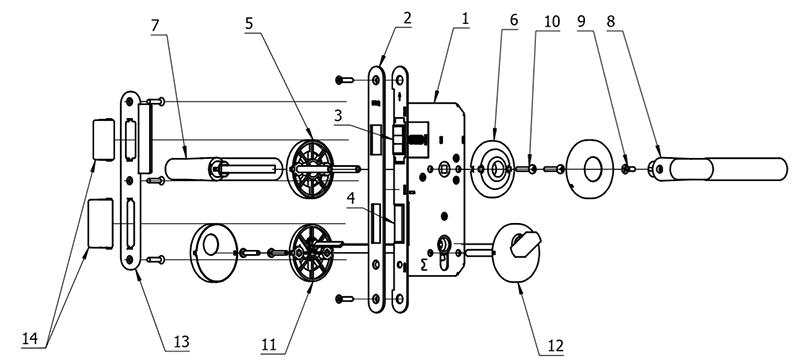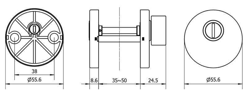 Install the cylinder thumb turn plates and tighten screws. Send the lock cylinder from the hole on the inside plate through the lock body and outer plate, then attach the cylinder to the front armor with cylindrical screws.