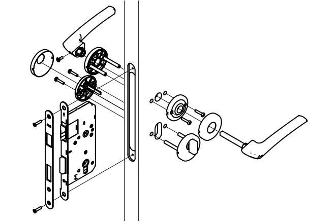 Test after installation: Rotate the lever handles and press the latch bolt by hand in the inclined surface direction. The latch bolt should freely turn over and smoothly be pressed into and removed from the lock body. When pressing the latch bolt without the rotating lever handle, the latch bolt will not turn over. If the latch bolt operates smoothly, installation is complete. If not, reset all components.