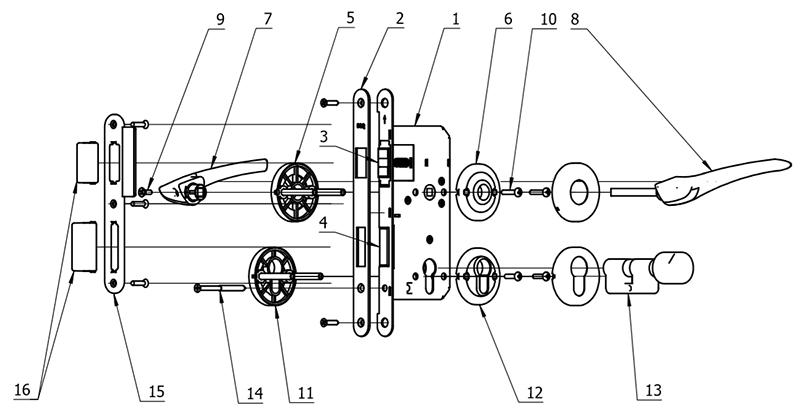 | 5 | Outer escutcheon plate | 13 | Cylinder lock |