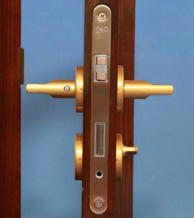 Test after installation: Rotate the lever handles and press the latch bolt by hand in the inclined surface direction. The latch bolt should freely turn over and smoothly be pressed into and removed from the lock body. When pressing the latch bolt without the rotating lever handle, the latch bolt will not turn over. If the latch bolt operates smoothly, installation is complete. If not, reset all components.